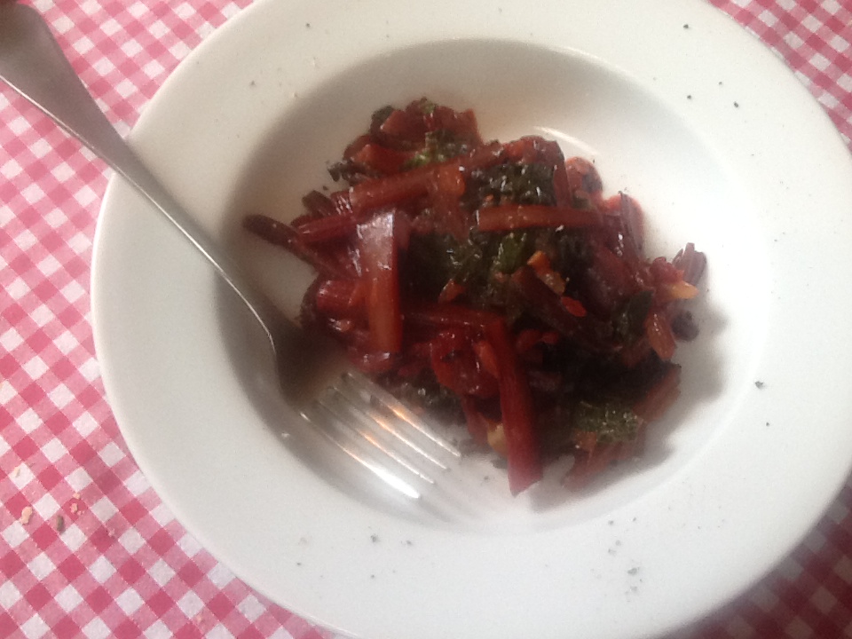 I love dual purpose things like a milk cow that effectively produces meat, chickens and quails that lay eggs and make delicious eating, and radishes and beetroot because one can eat the leaves, too. For lunch I prepared beetroot leaves as a side but we ate it as a main course because it tasted terrific. I washed and and cut the stems off as close to the root as I could get without damaging the skin of the beetroot. I wrapped the beet and a bit of rosemary in foil and popped it in to the oven while my bread was baking. I fried some garlic and rosemary in a teaspoon full of olive oil, chopped the leaves and stems, coarsely and added them to the pan. after frying for a minute I added about 2 tablespoons of water and covered the pan. Cook until tender adding a bit of water when necessary. Delicious. I intend eating the beetroot tomorrow dressed with some balsamic vinigar salad dressing and shaved Parmigiana cheese.