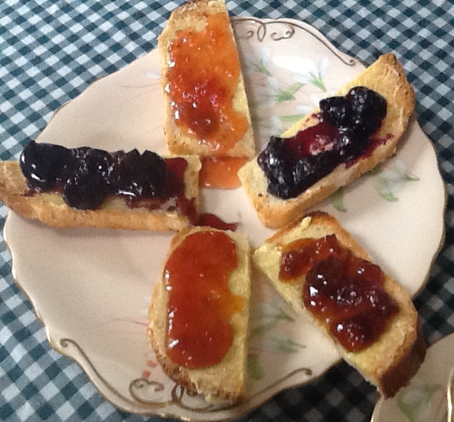 In the first picture I am cleaning bottles. Second picture shows the jams inside the bottles being pasteurised . Pictures 3 and 4 shows everything labled and packed. The jams pictured on toast are cherry (unsaleable seconds given to me by a farmer/market vendor), blueberry (picked on a local farm), apricot bought from the farmer on the Sunday market (most of which were eaten and given to the grand kids), plums from our tree, apples from our tree. I bought about $10 worth of sugar, and traded some eggs for lemons. All up costs for the lot was less than $30, or 16 cents per jar and I know what is in them – no preservatives, no thickeners, no setting agents, no coloring, no flavoring, no nothing – only fruit and sugar and it tastes FANTASTIC!