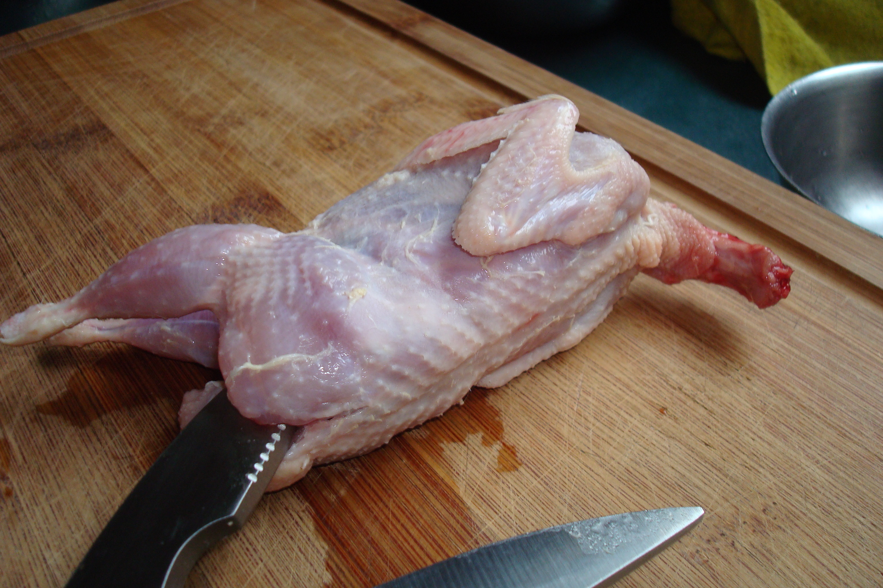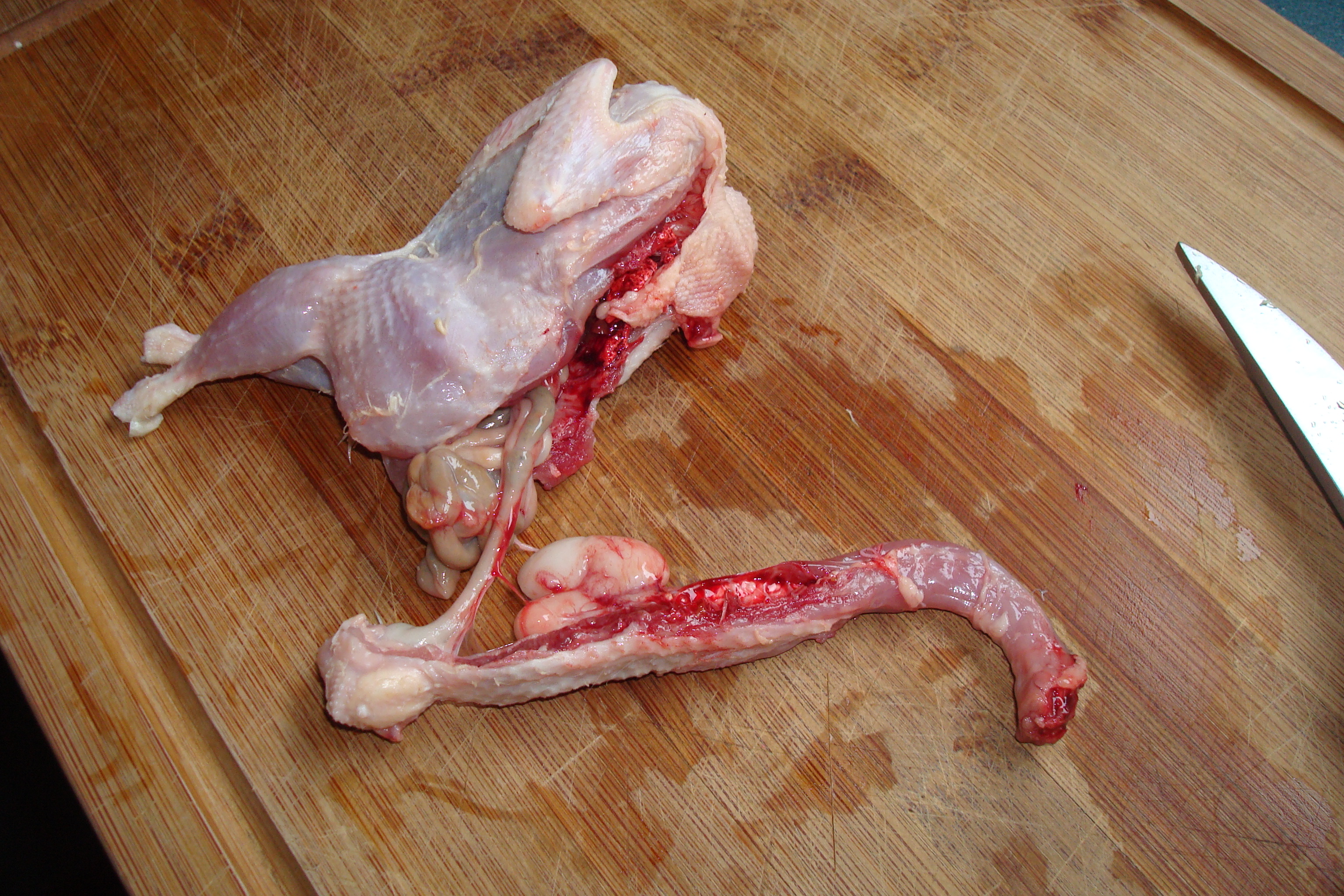Take a meat shear and insert from the back hard up against the backbone. Cut all along the backbone, keeping the inside tip of the shears close to the top, until you have cut through right to the front. Do the same to the other side of the backbone. If you keep your shears against the inside top, you would have missed all the entrails.