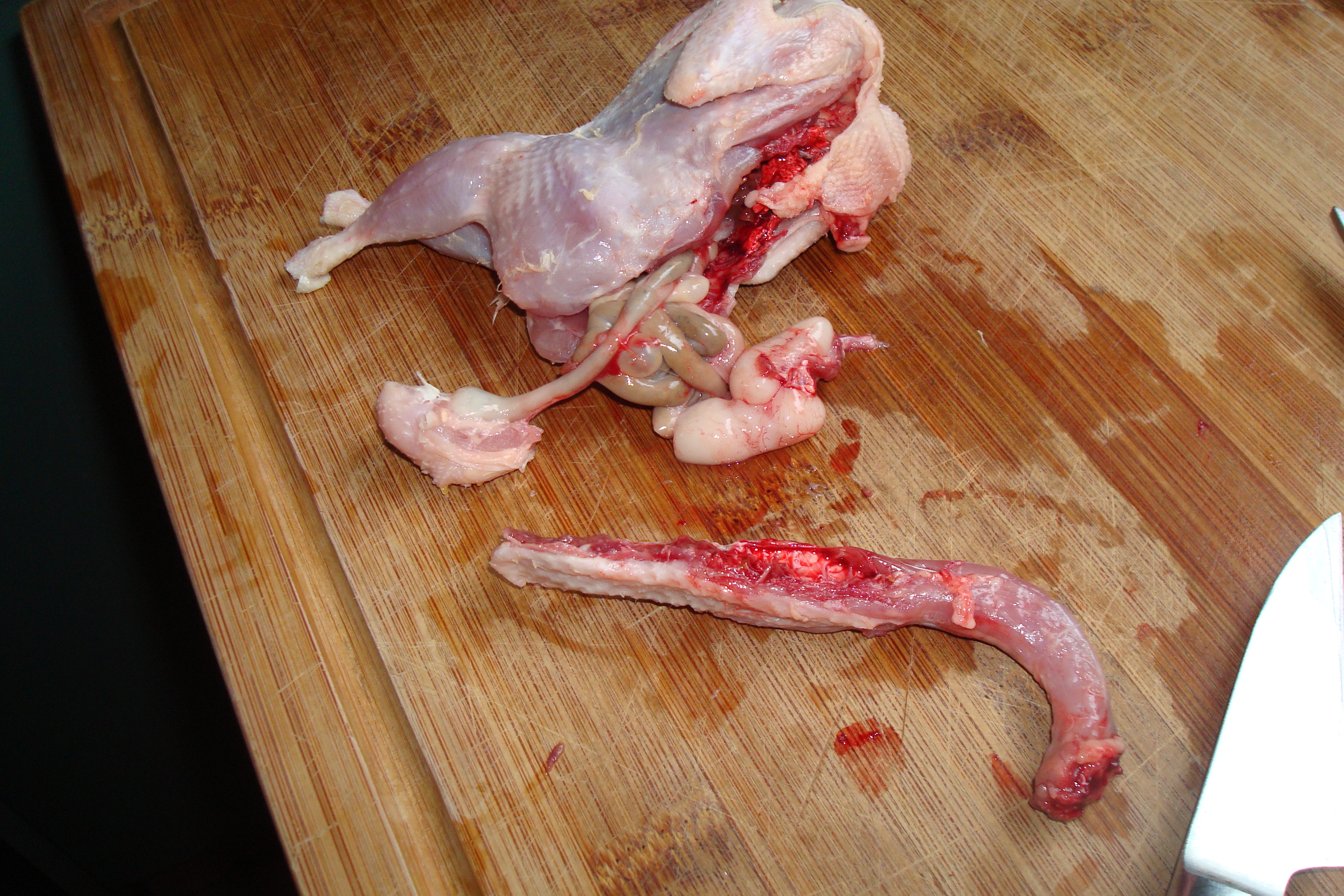 Cut through the backbone as close to the cloaca as possible. Also cut through the skin immediately below the cloaca. The backbone / neck sections goes straight into the dish holding all the parts to cook stock from. By inserting your middle finger underneath the entrails, starting from the back and moving your hand forward keeping your finger against the breastbone you will lift all the entrails out, intact without soiling the carcass.