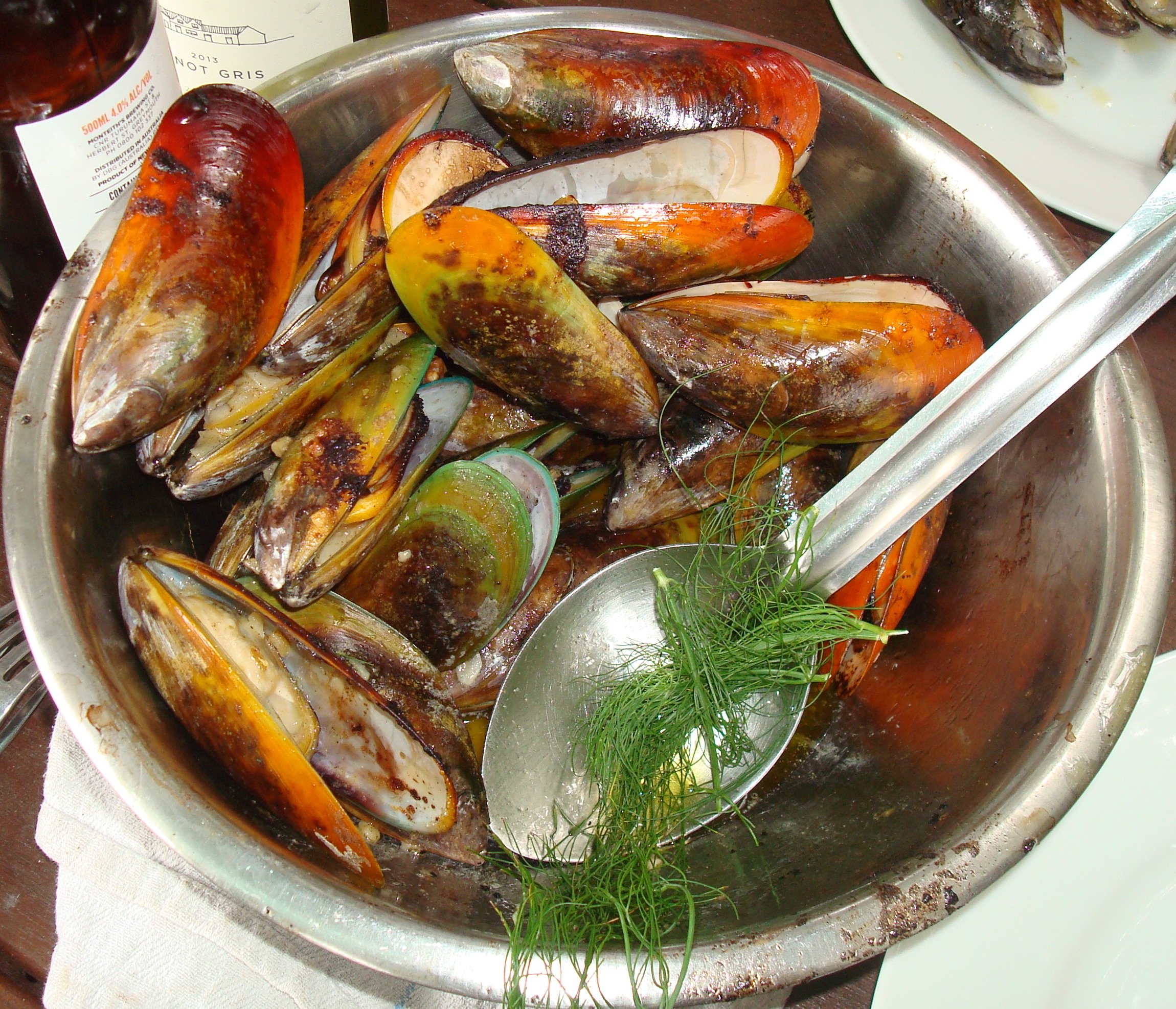 Put the olive oil, garlic and chili in a pot big enough to hold all the mussels. Gently soften the garlic, add the wine and the mussels. Cover the pot and turn up the heat. When the mussels have opened and released their juices, remove them from the pan, and reduce the sauce until there is only an inch or so left in the pot, add salt and pepper to taste. Add the mussels and the sauce that may have been released while standing, toss, warm through and serve with fresh bread and plenty of Pinot Grigio (here we have to settle for something completely different, namely Pinot Gris, which is heavier, darker and duller).