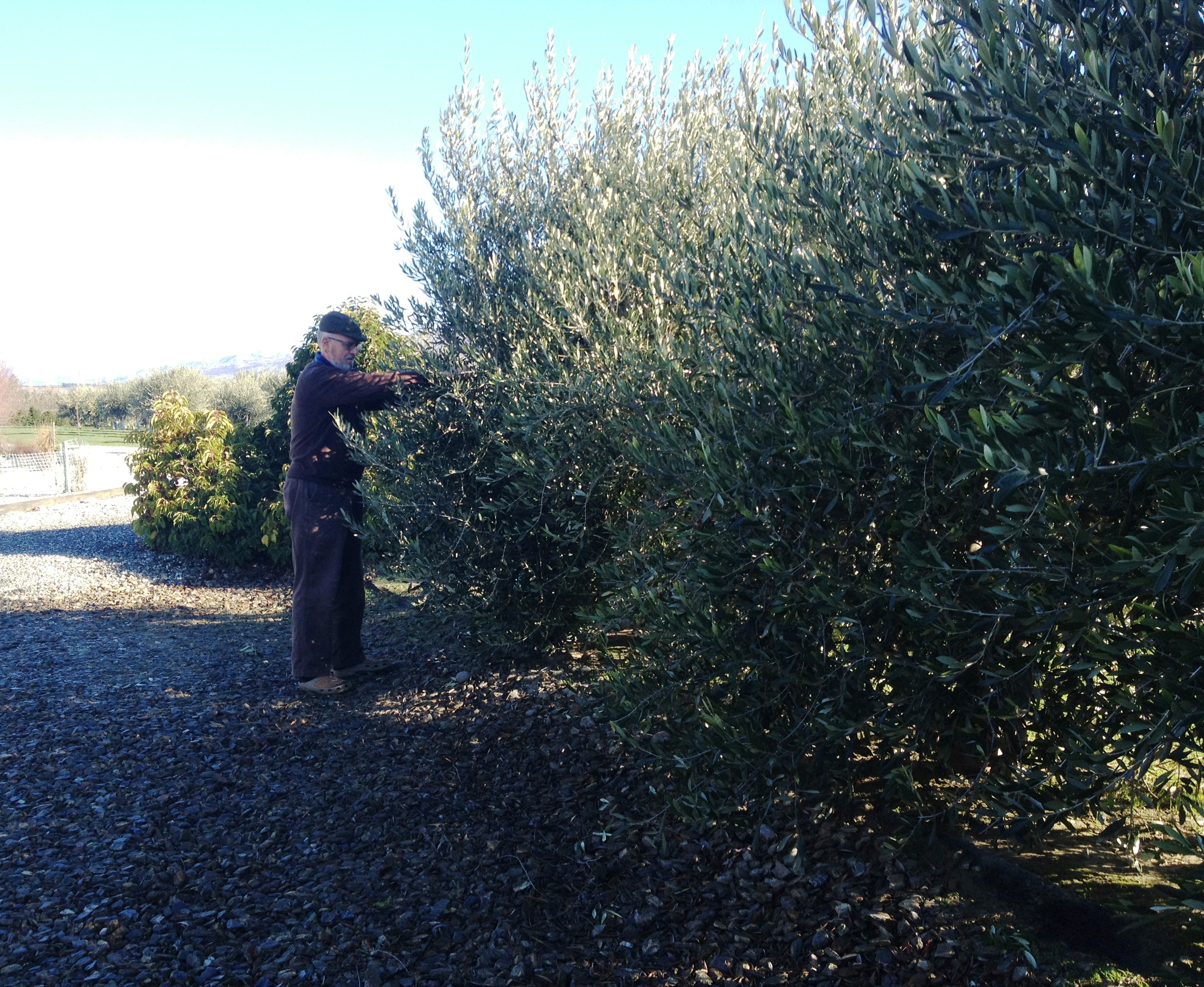 We love olives but are wary of the chemically saturated commercial products available. The solution is to cure our own the way it had been done traditionally in Italy. On the drive to Cromwell to collect olives we passed through beautiful, and often contrasting scenery, as one does when travelling in New Zealand. We stopped several times to admire the amazingly blue Clutha River. Normally rivers are colored muddy brown and the color and clarity of this river was quite thrilling. Then we passed by Cromwell where we once again stopped to look at the reflections of the mountains (one snowy peak in the background) in the water. In the distance tantalising, snow covered, mountains stayed just out of reach for close up pictures. The olive grove belongs to Bill and Helen Dunbar and is on the shores of Lake Dunstan. The lake and the snowy mountain tops are visible from everywhere, from the cleverly laid out open plan house and presses, to the trees when one is picking. The business markets fresh pressed olive oil which, once we got home, we compared with our favorite imported Italian brand and we are happy to report that it came out tops. There is much to be said for a fresh olive oil from good olives and carefully pressed and bottled. See the website http://www.Dunfordgrove.com