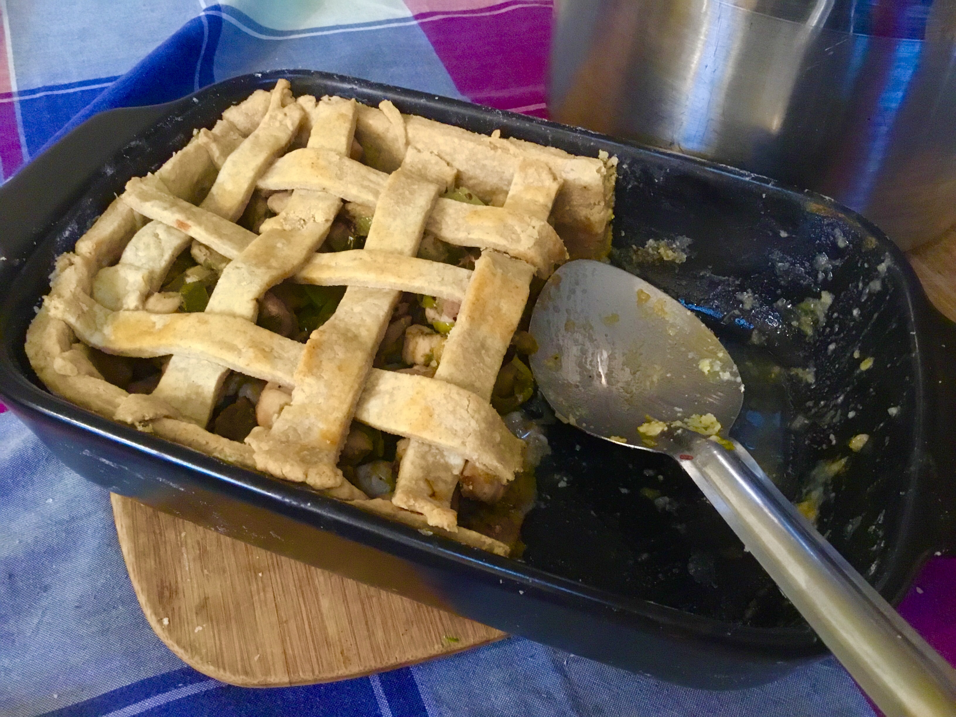 For the crust she made a short pastry using a few handfuls of flour, maize  meal fines and a bit of bran. A good rule of thumb is 400g flour to 150g butter. Use more butter if you like the pastry ‘shorter’.  You can buy puff pastry, it works just as well. Halve the pastry. Line the pie dish with half of the pastry and put the dish and leftover pastry in the fridge.