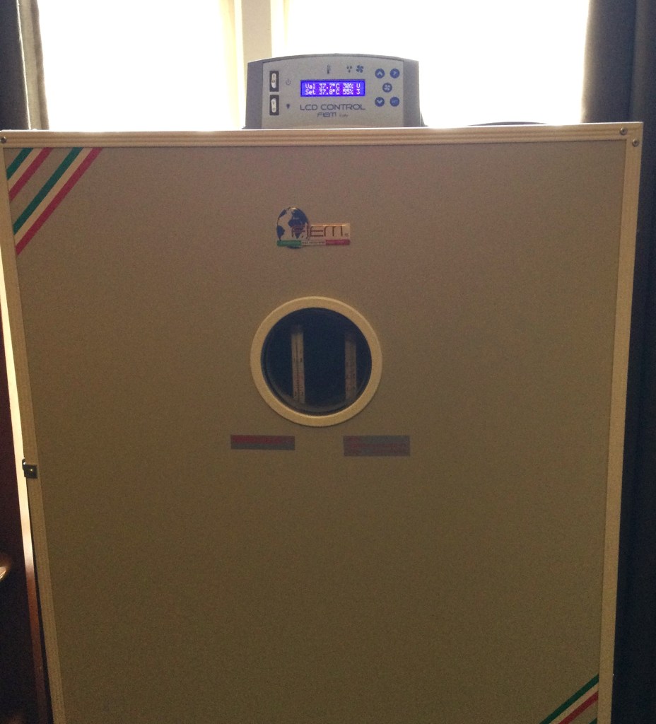 5. Incubators are set at 37.7 Celsius and 45 degrees Humidity. Hatchers are set at 37.5 C and 80 % Humidity. I monitor and adjust incubators and hatchers for both these two parameters with independent monitors as incubator measuring and displays are not always that accurate, even with my commercial, sophisticated and well proven machines. Notice the independent thermometers and wet bulb thermometers through the front windows of the machines. Preheat incubators and hatchers for a couple of hours before setting.