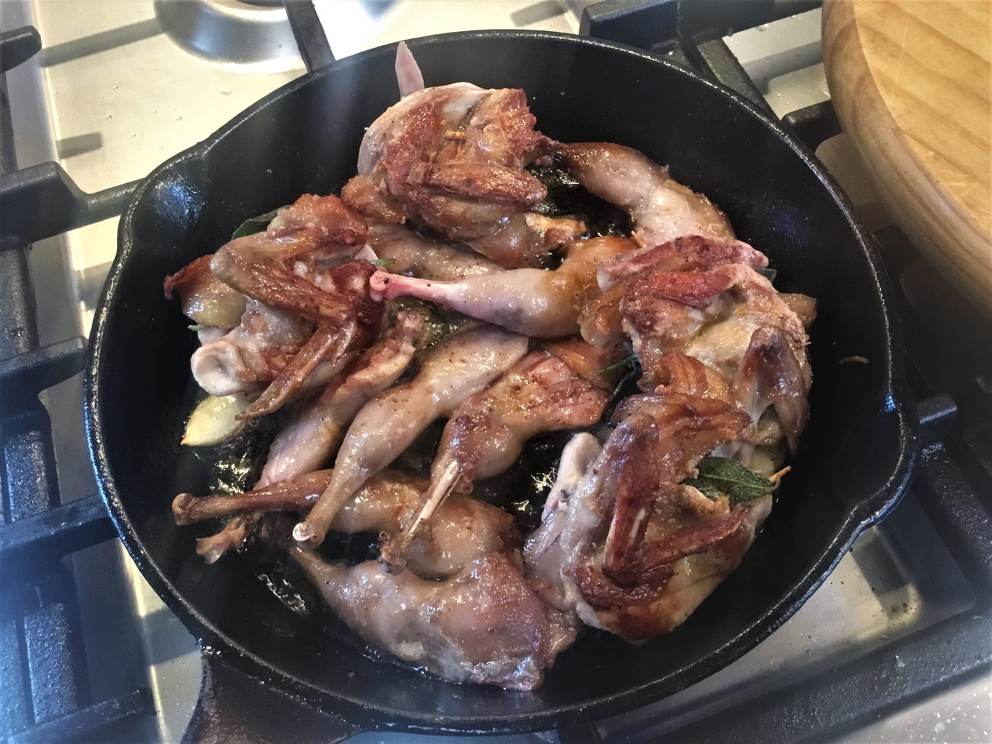 Use as many deboned quails as required. Season them generously all over with salt and freshly ground black pepper. Place a sage leaf, some coarsely chopped rosemary, and a few thin slices of pancetta inside the cavity of each quail. Secure the birds by stitching the sides together with skewers or tying them neatly with kitchen string.