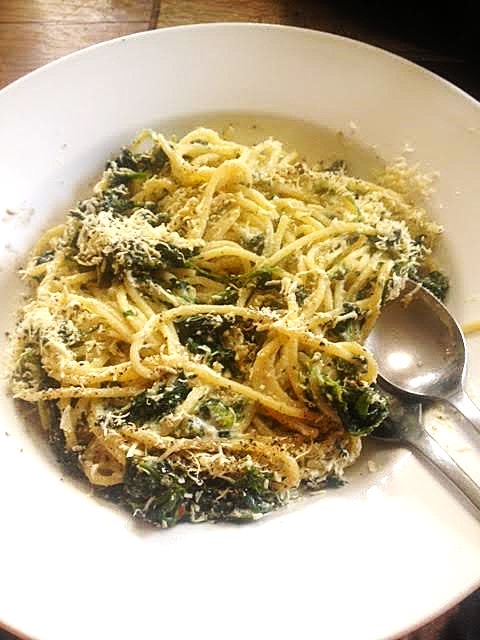 When the pasta has cooked, save 1/4 cup of the pasta water and drain the pasta. Pour the pasta directly into the anchovy and garlic sauce and mix well. Add a bit of the pasta water to the mix if needed. Serve immediately, put the cheese on the table so everyone can add cheese to taste