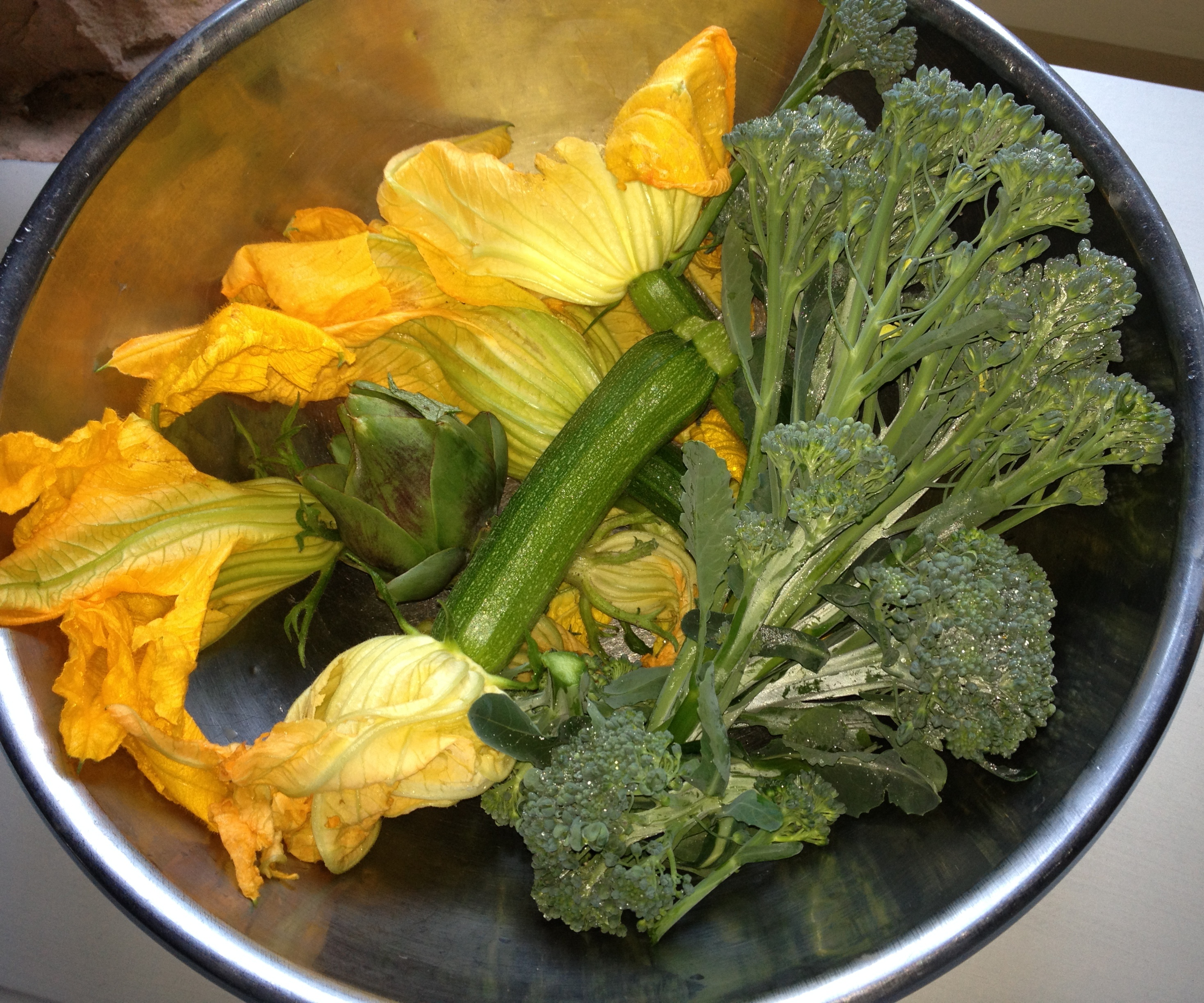 This was followed by artichokes again from our dairy farm in Port Chalmers. We like to cook it in water with a squeeze of lemon until the leaves come free when pulled lightly, then drained. Pull the leaves from the head and dip into good extra virgin olive oil with plenty of salt added to it and then rip the soft flesh from the leave with your teeth. After an enjoyable meal you eventually reach the pot of gold at the end of the rainbow – artichoke hearts!
