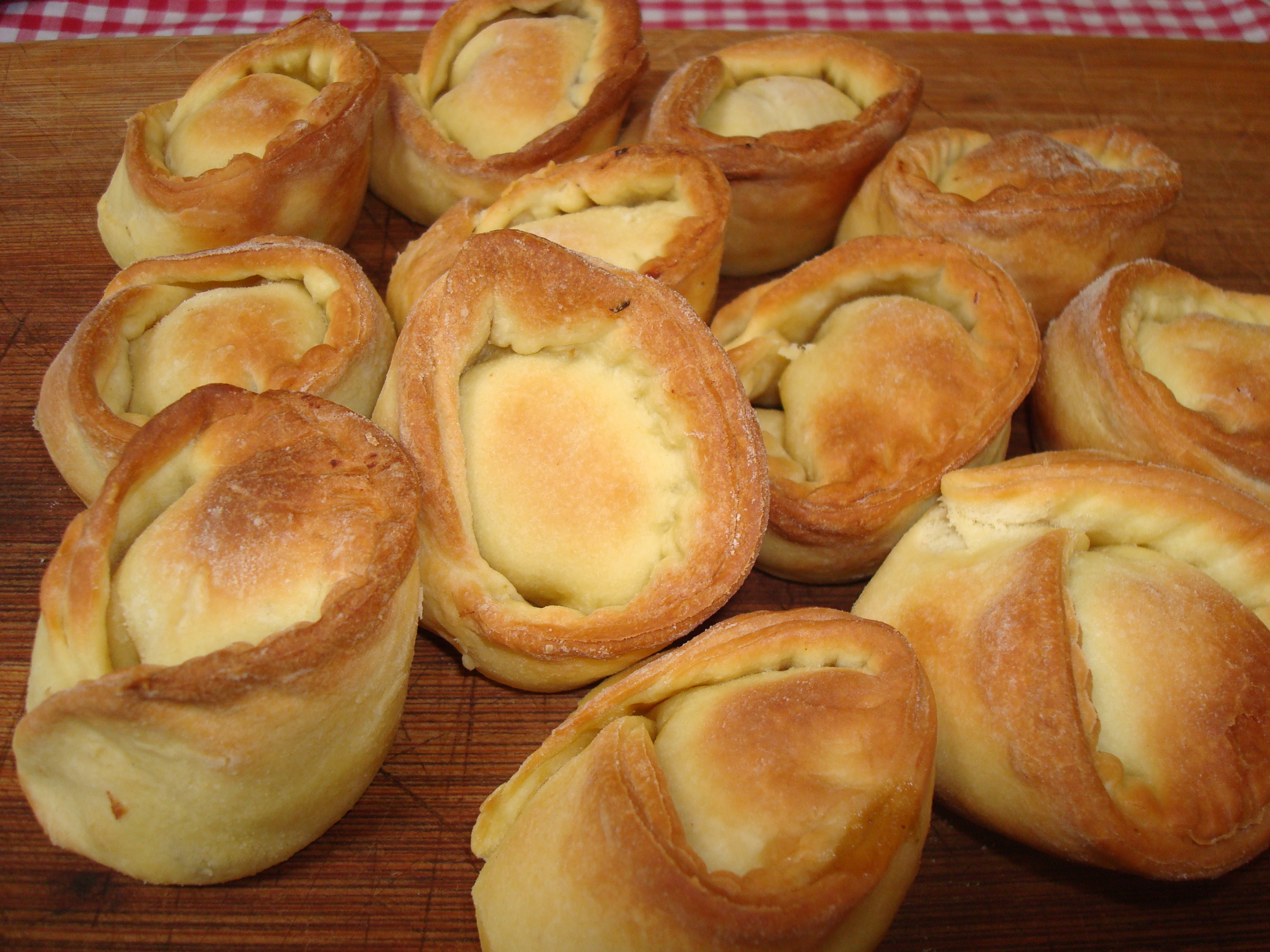 Mix all the ingredients including the yeast together. You should have a stiff dough like a pasta dough after kneading it a bit. Let the dough stand in a warm spot until the yeast is activated. Roll the dough out thinly – less that 1 mm thick. I do mine with a pasta machine setting on 5 . Cut circles with a cookie cutter about 100 mm in diameter. Put about 1 tablespoon of filling in the center and fold the dough to close after painting the edges lightly with some egg to bind – press closed with the back of a fork. Now fold the wings in and secure the to end together with some egg again. Place in a well buttered muffin pan and bake at 200 C until brown on top. Eat warm or cold.