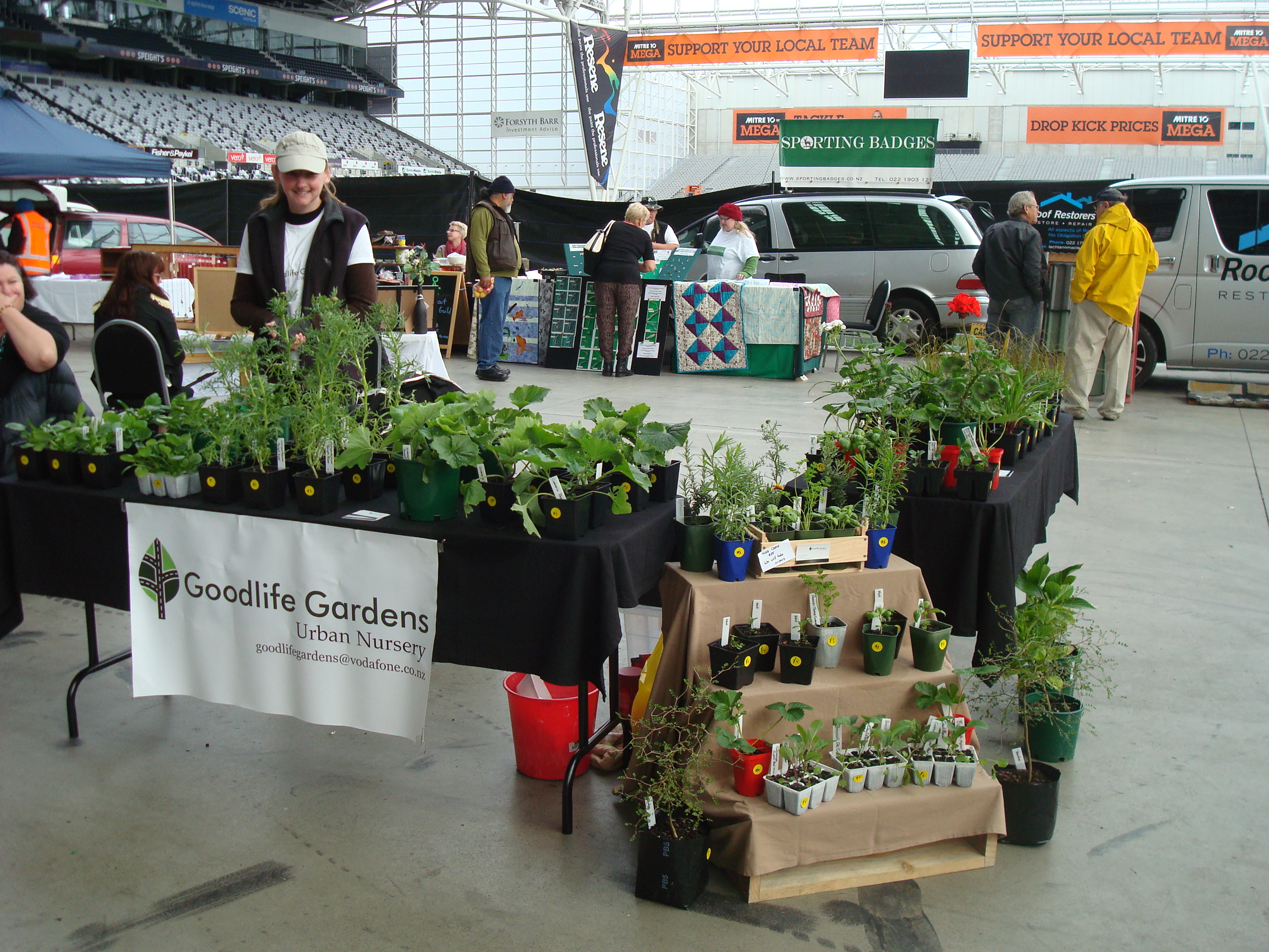 Growing food in the back yard or open urban spaces is something I feel strongly about. Creating awareness of the possibilities of having sustainable back yards is also a passion of Kimberley from Goodlife Gardens. She is tertiary qualified ( Horticulture, Permaculture, Organics, and Sustainable Living at Otago Polytechnic) and says: ‘ Whilst I currently stock a lot of flowering annuals and perennials, the plan is to have for sale a variety of healthy seasonal fruit and vege plants grown in local climate and cared for as if they were to feed my own family. Container planting and companion planting is something I am passionate about – it opens up opportunities for people to grow for themselves in areas not conducive to in-ground gardening (such as student flats and apartments) ‘. The stall is well stocked and neatly set up, and a pleasure to browse through.